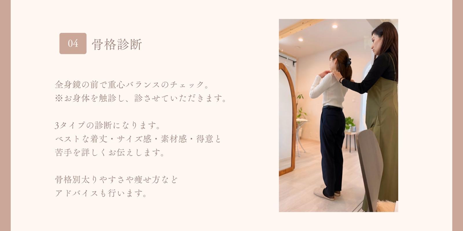 【骨格診断】では、骨格や筋肉・脂肪・肌質により3タイプのどれに当てはまるか診断します。生まれ持った体のラインや肌質のタイプを知ることで、似合うファッションの素材や形をセレクトしファッションを心から楽しむことが出来ます!(詳しくは骨格診断のページをご覧ください)